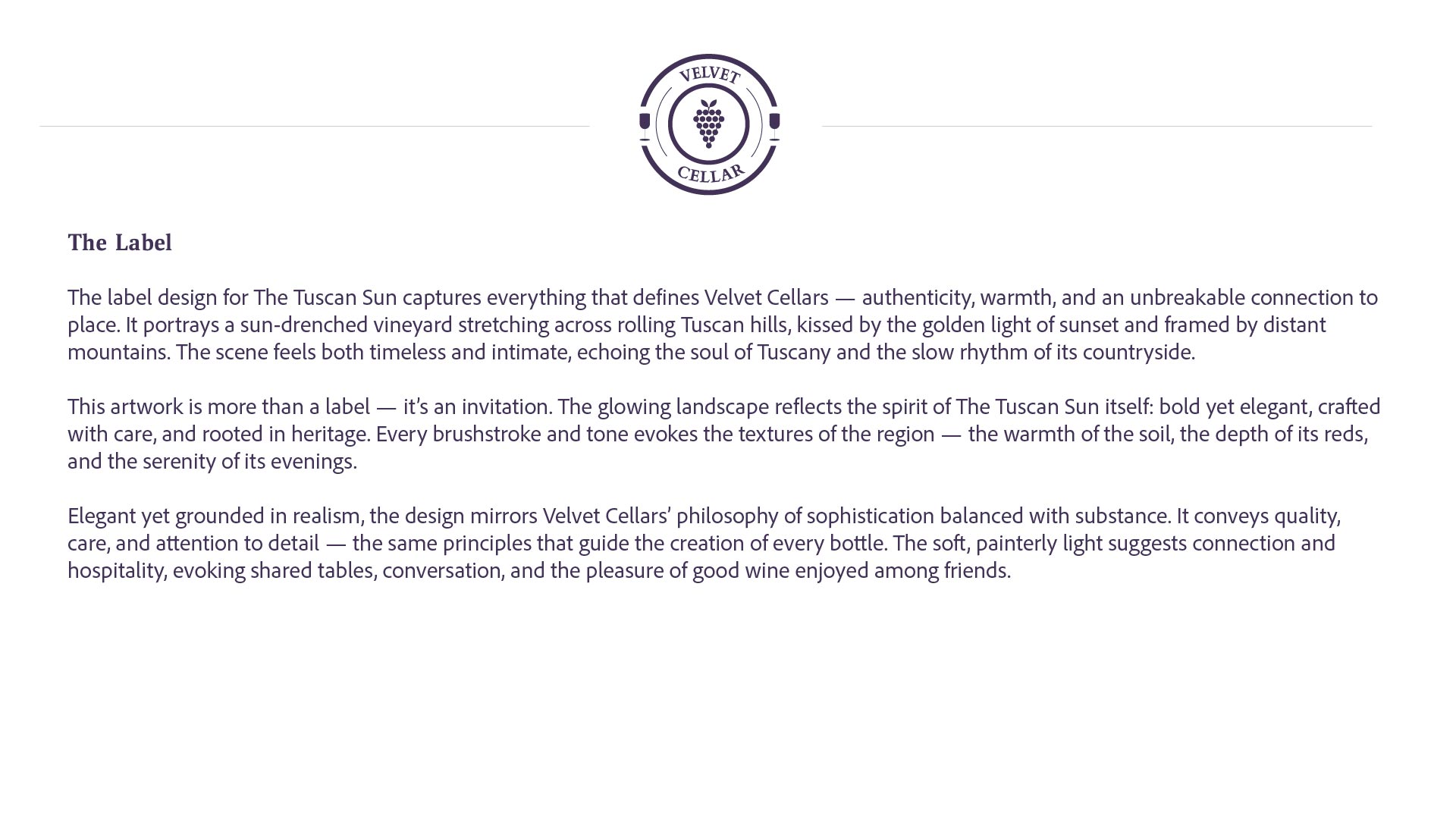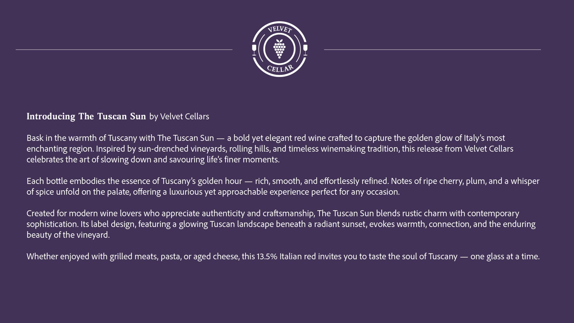 Inspired by sun-drenched vineyards, rolling hills, and timeless winemaking tradition, this release from Velvet Cellars celebrates the art of slowing down and savouring life’s finer moments.